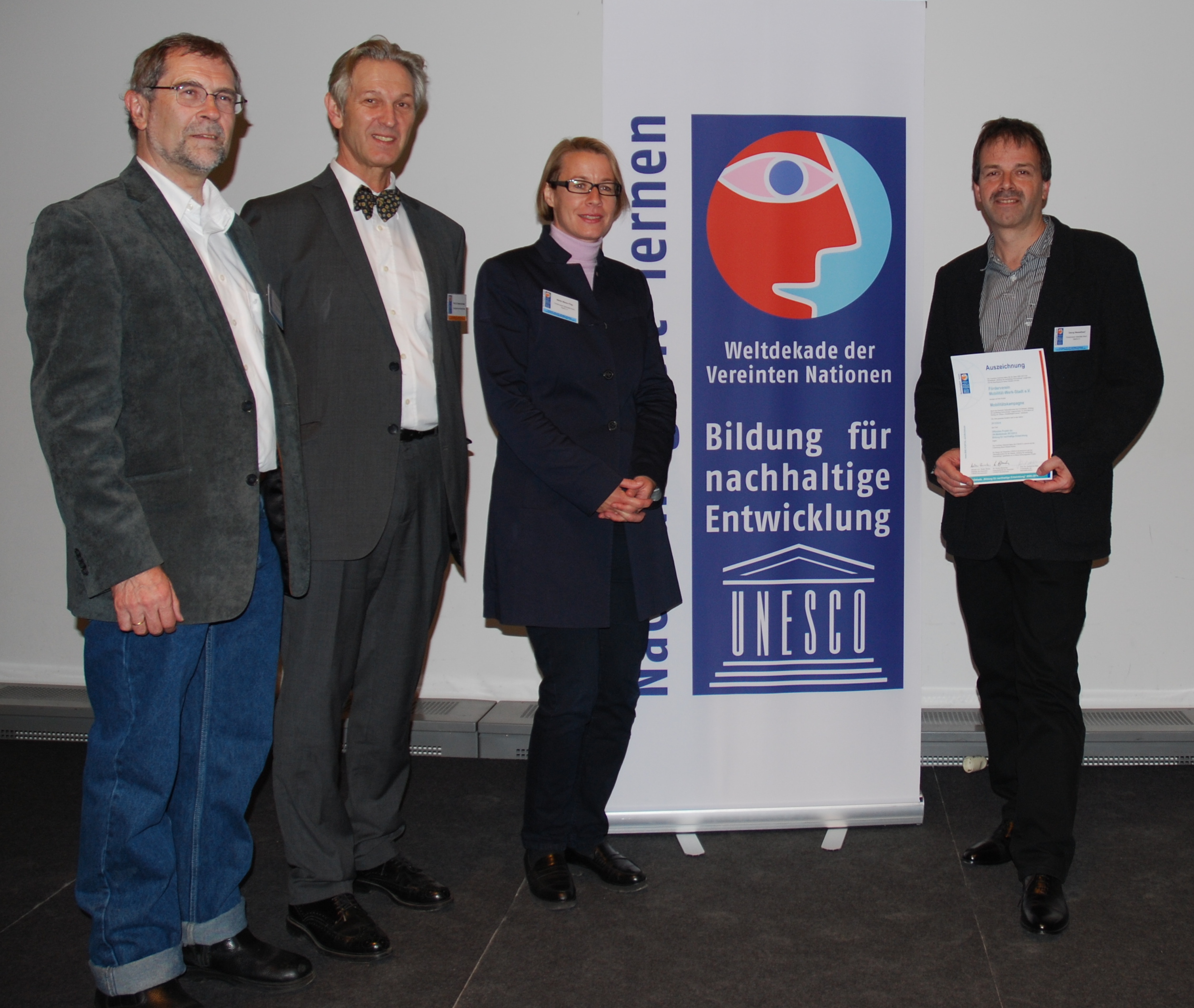Martin Arnold und Meike Maser-Plag eine Urkunde, einen Stempel und eine Fahne von Prof. Dr. Gerhard de Haan, dem Vorsitzenden des Nationalkomitees und der Jury der UN-Dekade